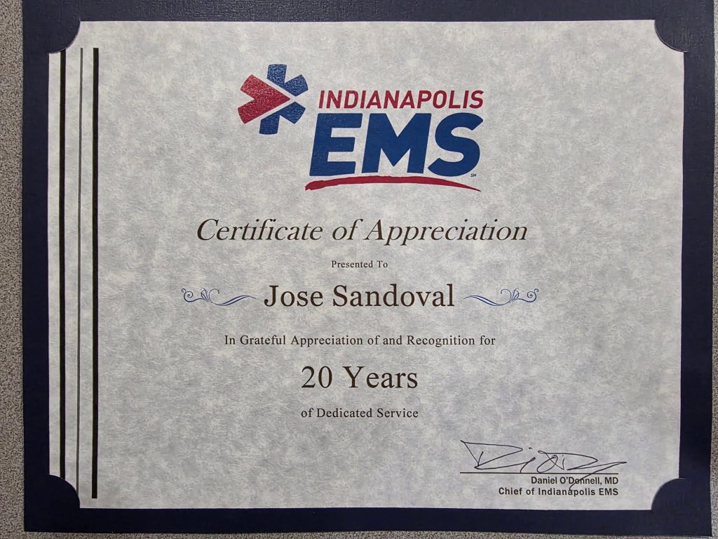 Congratulations to Post 360 Charter Member Jose Sandoval for 20 years of service with Indianapolis EMS.